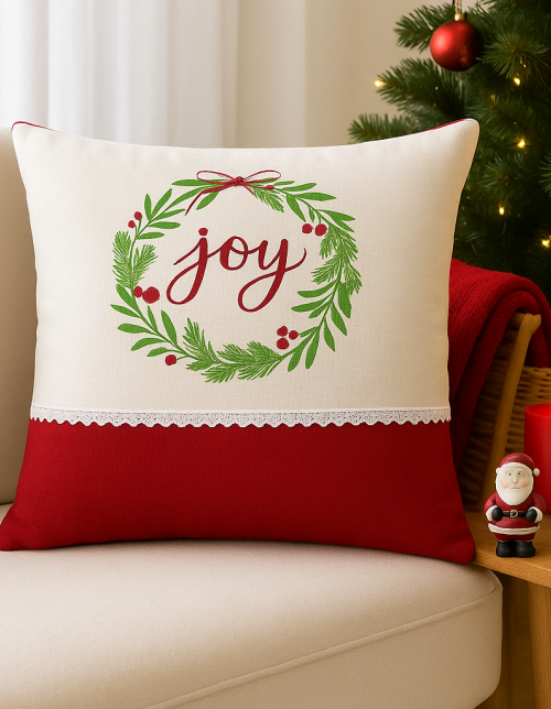 This festive cushion cover is designed to add Christmas cheer to home décor with a charming "Joy" wreath design featuring green foliage, red berries, and a decorative bow.