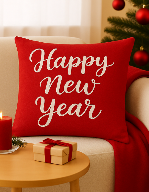 A vibrant red, square-shaped cushion cover featuring the phrase "Happy New Year" in an elegant white script font. The design is festive, suitable for Christmas and New Year's celebrations.